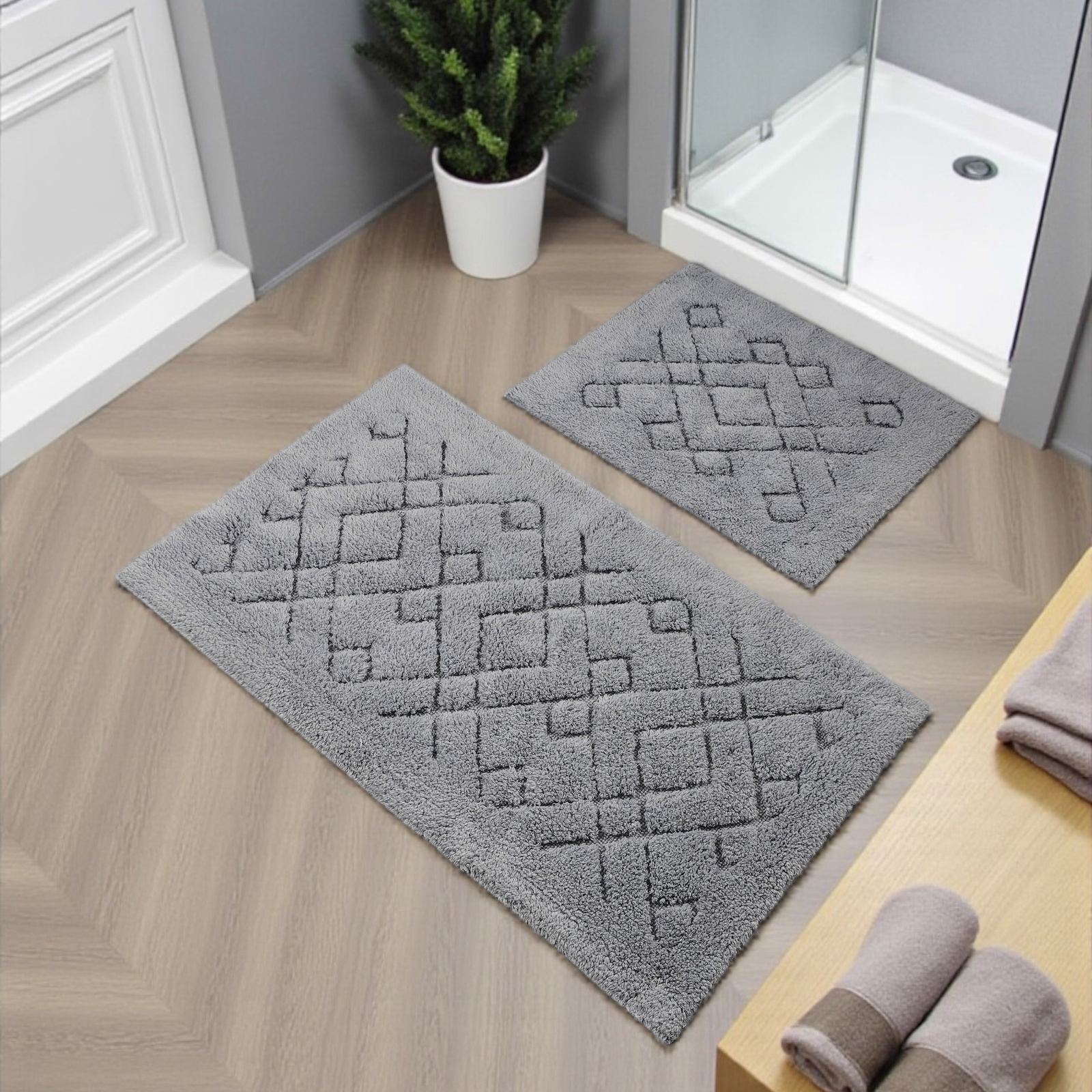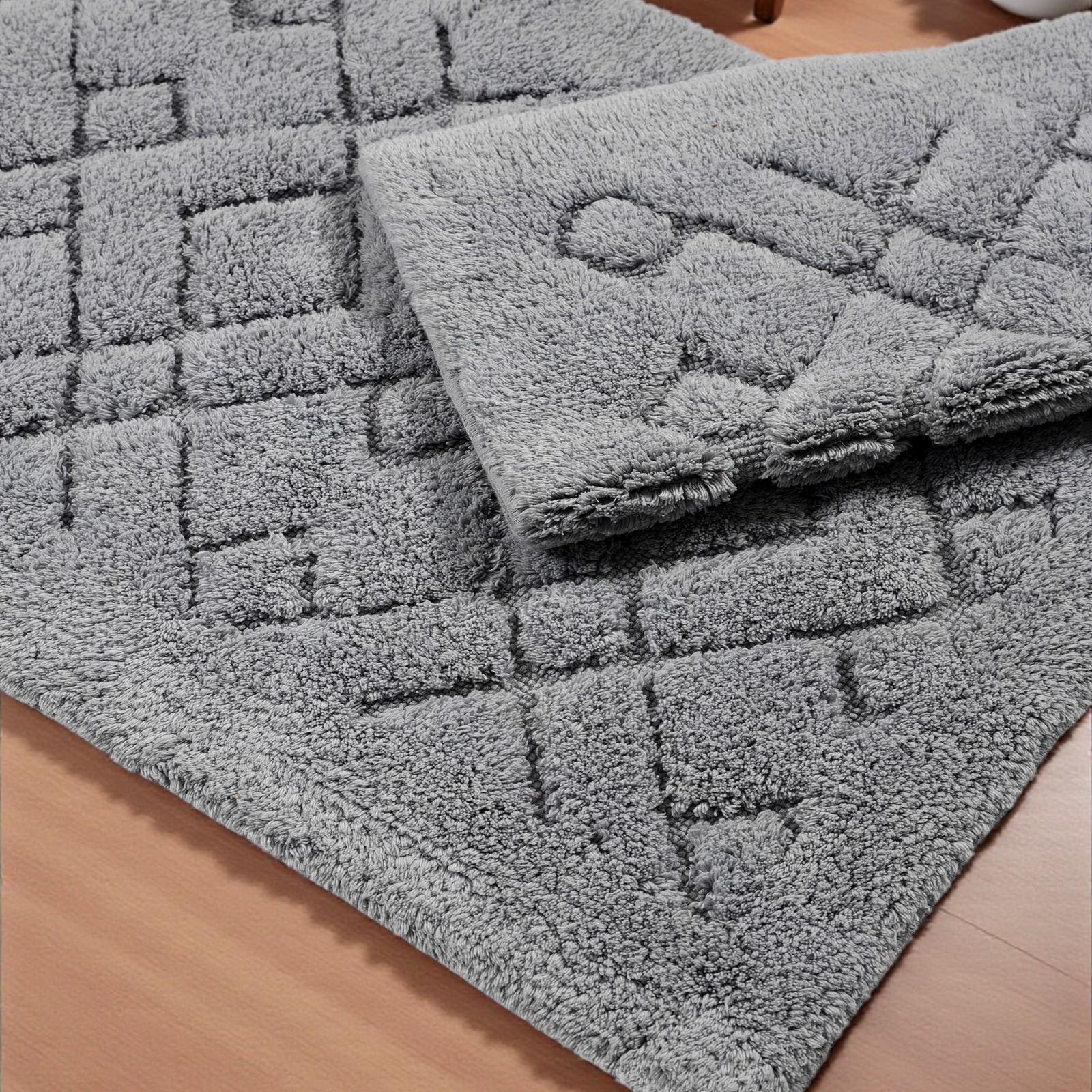 Na komplet składają się dwa dywaniki łazienkowe, w rozmiarze: 60 cm x 100 cm i 50 cm x 60 cm.