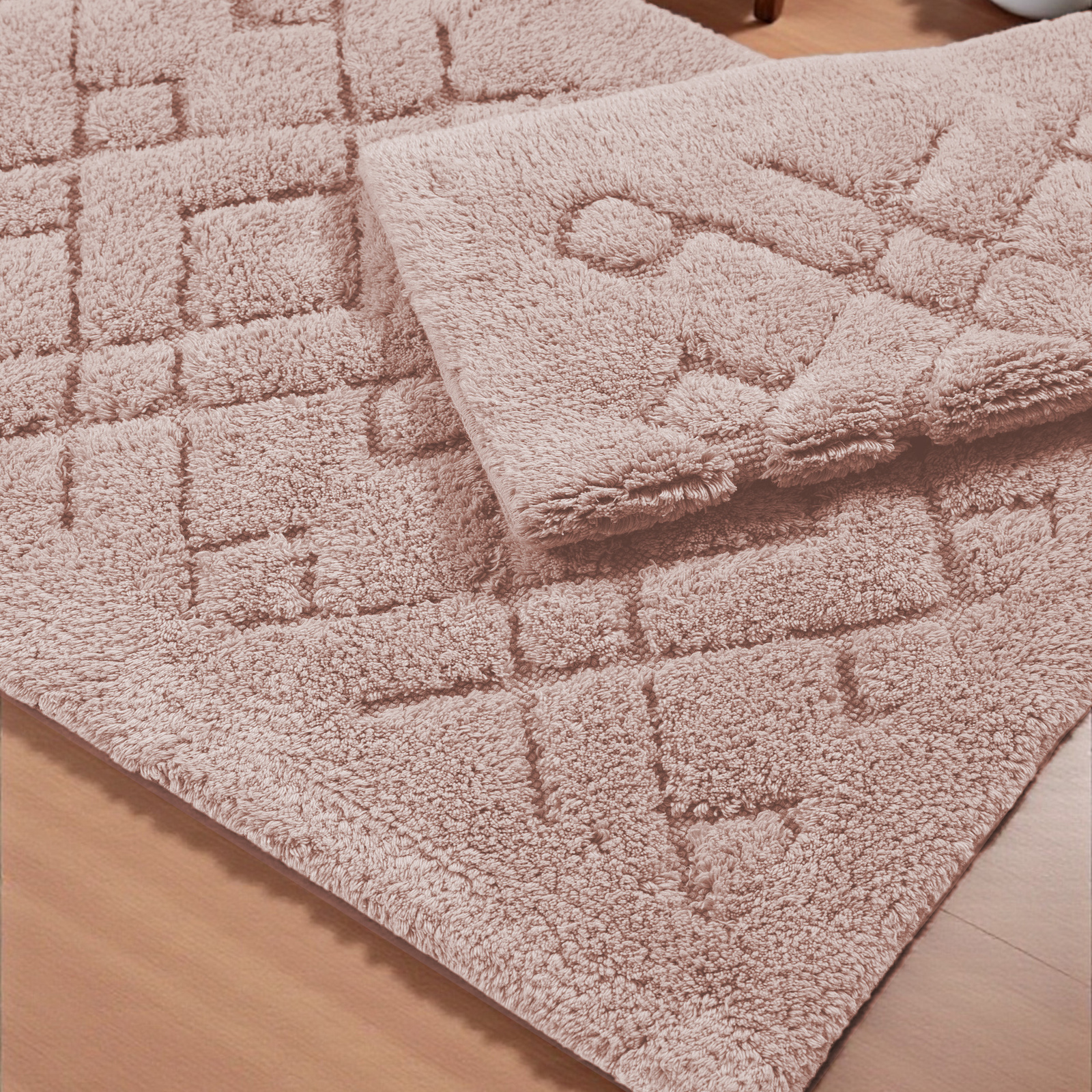 Wysokiej jakości komplet łazienkowy Bostoneo 12 - Pink ma sprężyste, chłonne runo, które wykonane jest w 100% z bawełny. Ten elegancki i wytrzymały komplet łazienkowy ma subtelny wzór w odcieniach różu.