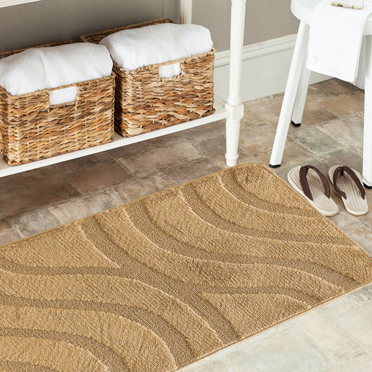 Wysokiej jakości komplet łazienkowy z wycięciem pod toaletę Montenegro Fale - Ciemny beż ma bardzo mocne, zwarte i sprężyste runo o wysokości +/- 10 mm, które wykonane jest w 100% z włókien polipropylenowych. Ten elegancki i wytrzymały komplet łazienkowy ma modny wzór w odcieniach beżu.