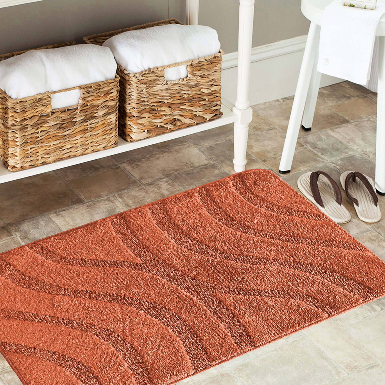 Wysokiej jakości komplet łazienkowy z wycięciem pod toaletę Montenegro Fale - ginger ma bardzo mocne, zwarte i sprężyste runo o wysokości +/- 10 mm, które wykonane jest w 100% z włókien polipropylenowych. Ten elegancki i wytrzymały komplet łazienkowy ma modny wzór w odcieniach imbirowej pomarańczy z nutą sorbetu