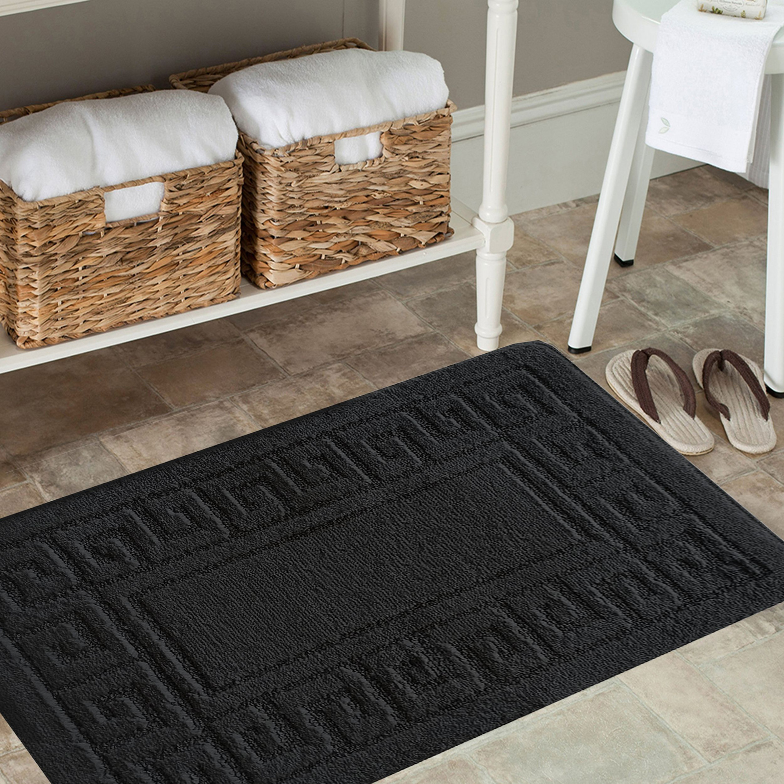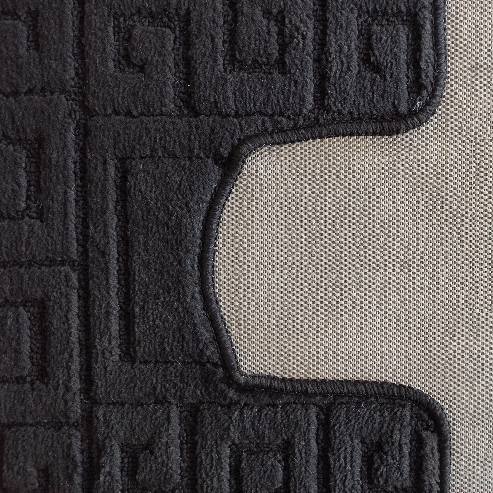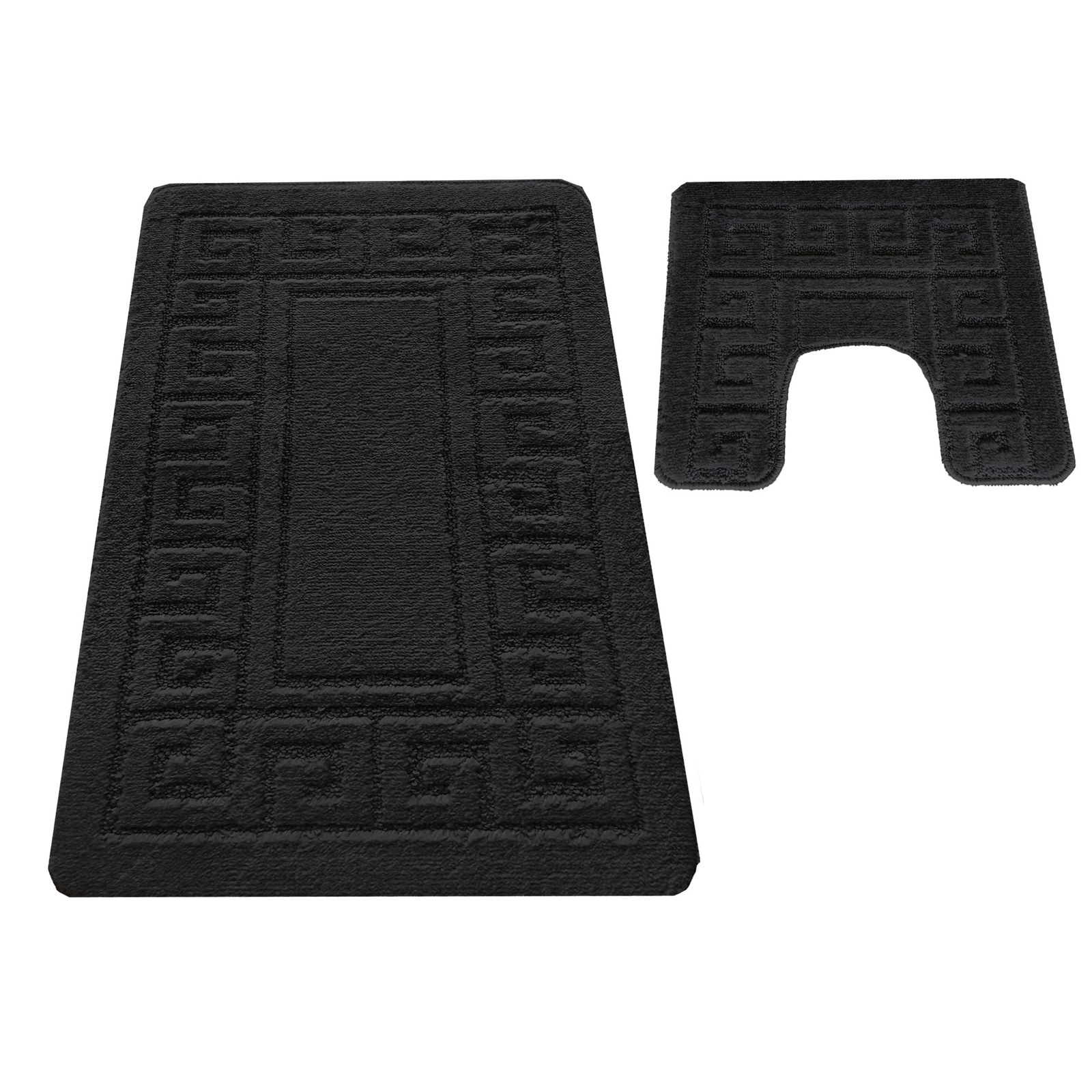 Wysokiej jakości komplet łazienkowy z wycięciem pod toaletę Montenegro GRECKI- black ma bardzo mocne, zwarte i sprężyste runo o wysokości +/- 10 mm, które wykonane jest w 100% z włókien polipropylenowych. Ten elegancki i wytrzymały komplet łazienkowy ma modny grecki wzór w odcieniach czerni.